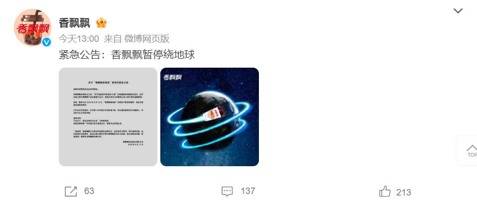 9月13日,香飘飘发文:“紧急公告:香飘飘暂停绕地球。”