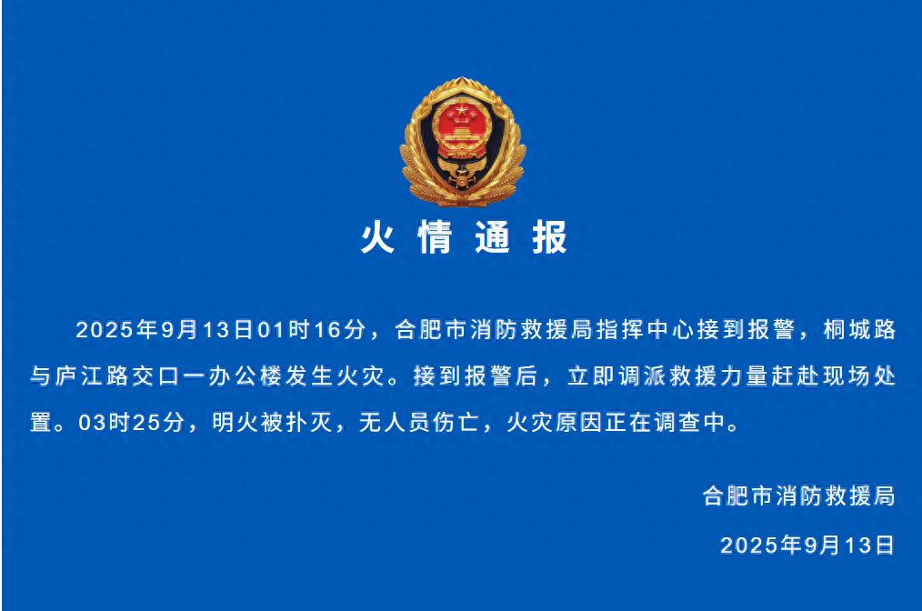 2025年9月13日01时16分,合肥市消防救援局指挥中心接到报警,桐城路与庐江路交口一办公楼发生火灾。接到报警后,立即调派救援力量赶赴现场处置。03时25分,明火被扑灭,无人员伤亡,火灾原因正在调查中。