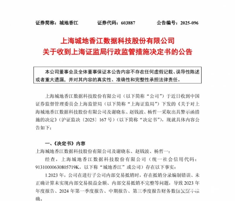 2025年9月11日,公司公告称收到《上海证监局行政监管措施决定书》,公告显示,城地香江财报存在三大差错。