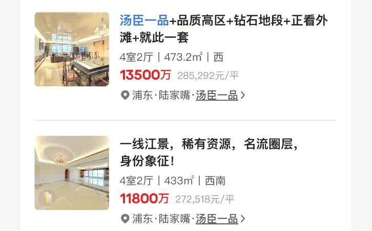 贝壳找房App显示,目前汤臣一品挂牌均价超过28万元/平方米,在售房源总价均在1个小目标以上。公示可查的成交记录已经要追溯到2015年,当年6月和11月各成交了一套430平方米以上的4室2厅。