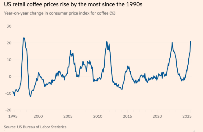 美国零售咖啡价格在刚刚过去的八月创下了本世纪最大同比涨幅,因特朗普政府对全球最大咖啡生产国巴西的进口关税正加剧咖啡供应短缺的影响。