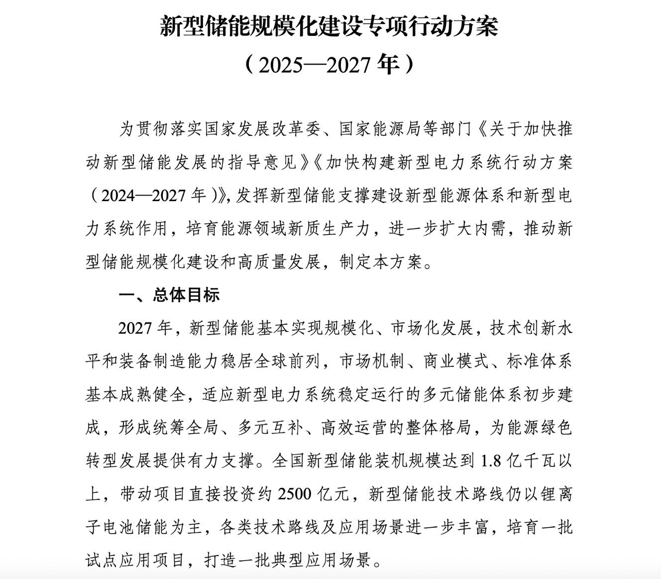 在总体目标中,《行动方案》提出,2025-2027年三年内全国储能新增装机容量超过1亿千瓦;到2027年,全国新型储能装机规模达到1.8亿千瓦(180 GW)以上,带动项目直接投资约2500亿元,新型储能技术路线仍以锂离子电池储能为主,各类技术路线及应用场景进一步丰富,培育一批试点应用项目,打造一批典型应用场景。