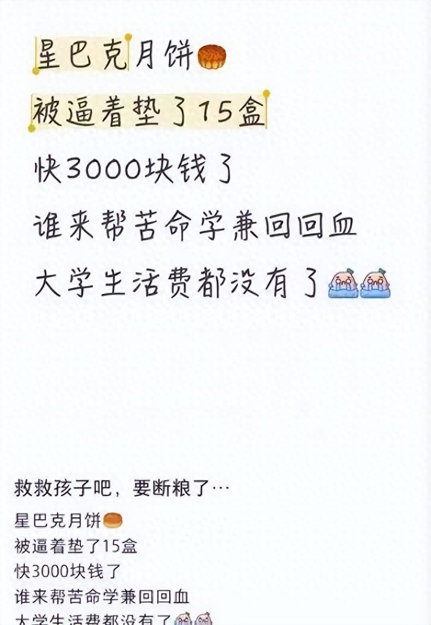 据悉,在2023年,有不少网友将星巴克月饼档期形容为“星巴克噩梦之一”,并配文表示,“每年这个时候,星巴克伙伴的噩梦”“据店里伙伴说月饼很难卖,店长给每个人分配了任务,给我分配要卖15盒”。