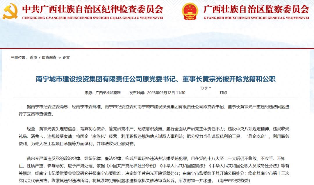 经南宁市委批准,南宁市纪委监委对南宁城市建设投资集团有限责任公司原党委书记、董事长黄宗光严重违纪违法问题进行了立案审查调查。