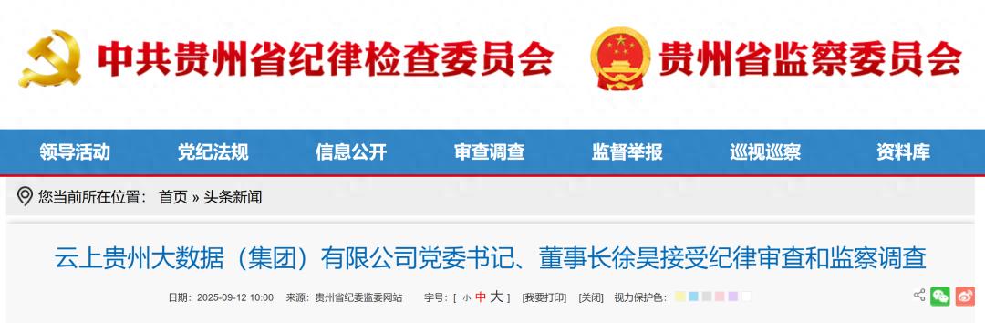 据贵州省纪委监委消息:云上贵州大数据(集团)有限公司党委书记、董事长徐昊涉嫌严重违纪违法,目前正接受贵州省纪委监委纪律审查和监察调查。