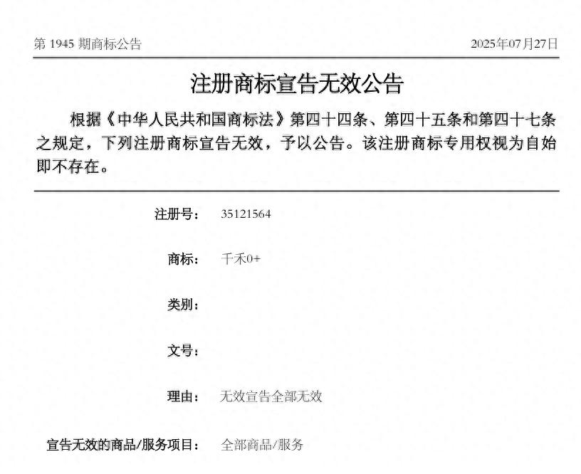 第1945期商标公告《注册商标宣告无效公告》显示,根据《中华人民共和国商标法》第四十四条、第四十五条和第四十七条之规定,下列注册商标宣告无效,予以公告。其中包含,千禾味业食品股份有限公司注册号为35121564的商标“千禾0+”。