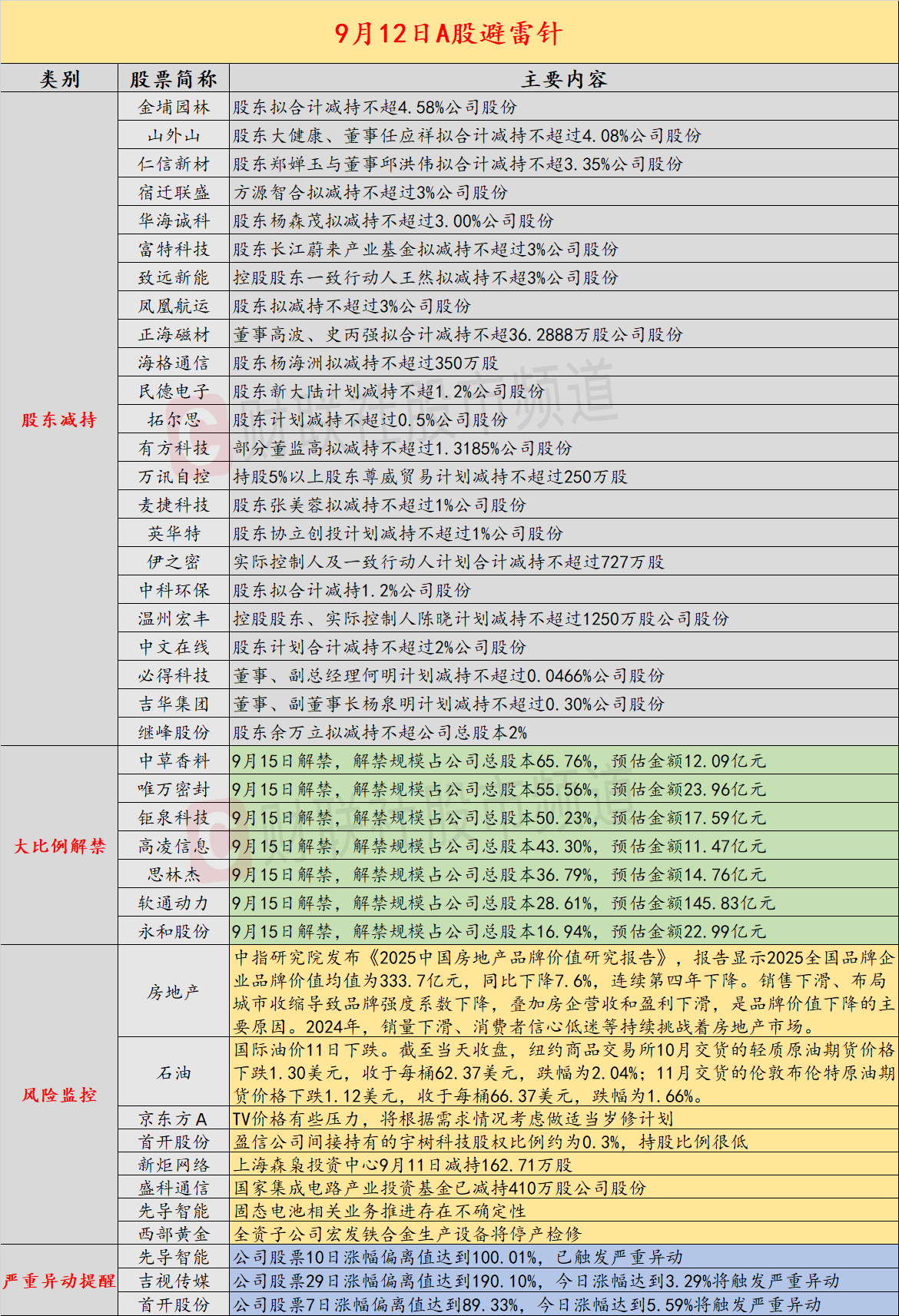 导读:财联社9月12日投资避雷针,近日,A股及海外市场潜在风险事件如下。国内经济信息方面包括:1)国内商品期市夜盘收盘多数下跌,能源品领跌;2)机构报告称,全国房地产品牌价值连续第四年下降;公司方面重点关注包括:1)京东方A表示,TV价格有些压力,将根据需求情况考虑做适当岁修计划;2)首开股份提示风险,盈信公司间接持有的宇树科技股权比例约为0.3%,持股比例很低;海外市场重点关注包括:1)美股三大指数齐创收盘新高,甲骨文跌超6%;2)交易员减少对欧洲央行宽松政策的押注,暗示欧洲降息周期已结束。