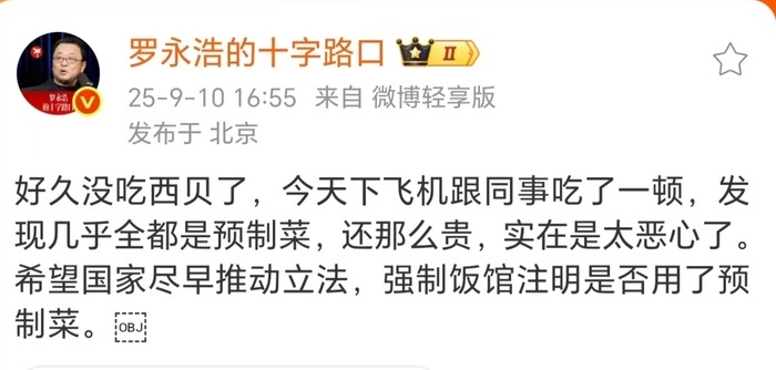9月10日下午,罗永浩在社交账号“罗永浩的十字路口”发文称,自己和同事去西贝吃饭,“发现几乎全都是预制菜,还那么贵”,“希望国家尽早推动立法,强制饭馆注明是否用了预制菜”。