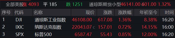 美东时间周四,美股三大指数齐创新高。截至收盘,道指涨1.36%报46108点,标普500指数涨0.85%报6587.47点,纳指涨0.72%报22043.07点。
