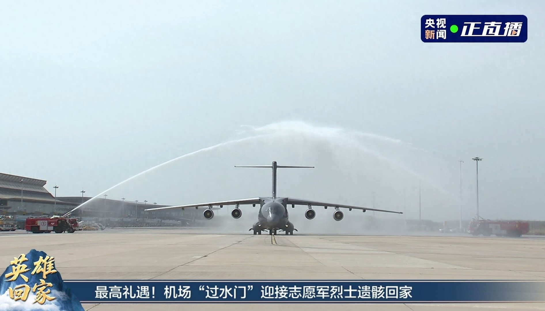 运-20专机降落沈阳桃仙国际机场后,机场以“过水门”最高礼遇迎接英雄回家。