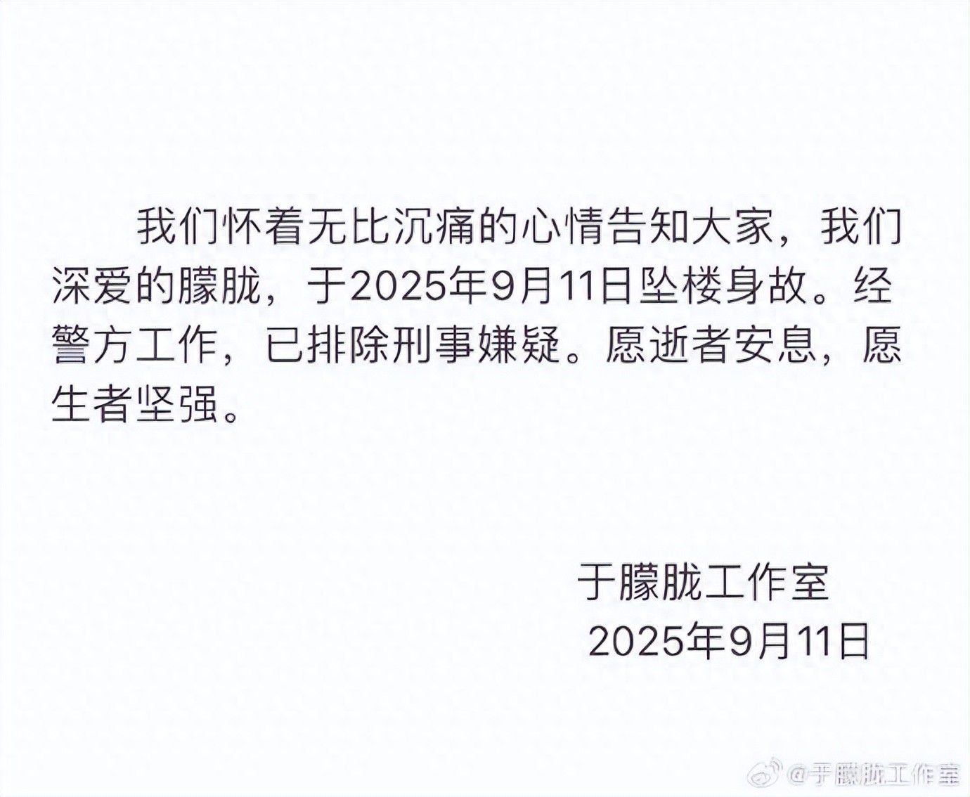 9月11日,于朦胧工作室在微博发文,“我们怀着无比沉痛的心情告知大家,我们深爱的朦胧,于2025年9月11日坠楼身故。经警方工作,已排除刑事嫌疑。愿逝者安息,愿生者坚强。”