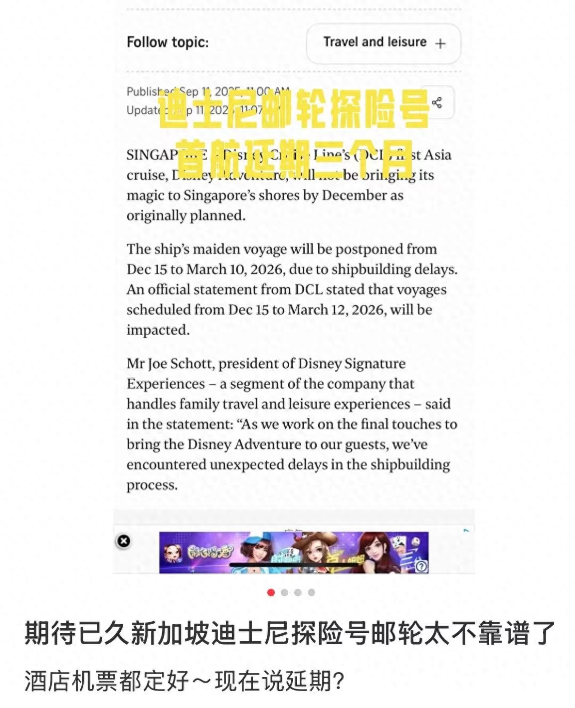 9月11日,有网友在社交平台称,收到官方邮件通知,新加坡迪士尼游轮“探险号”首航延期,由原定2025年12月15日推迟到2026年3月10日。