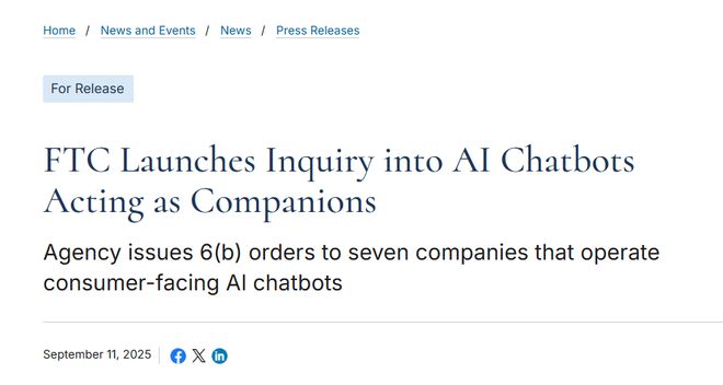 当地时间周四(9月11日),美国联邦贸易委员会(FTC)宣布已向七家公司发出命令,要求他们提供信息,以了解人工智能聊天机器人可能对儿童和青少年的负面影响。