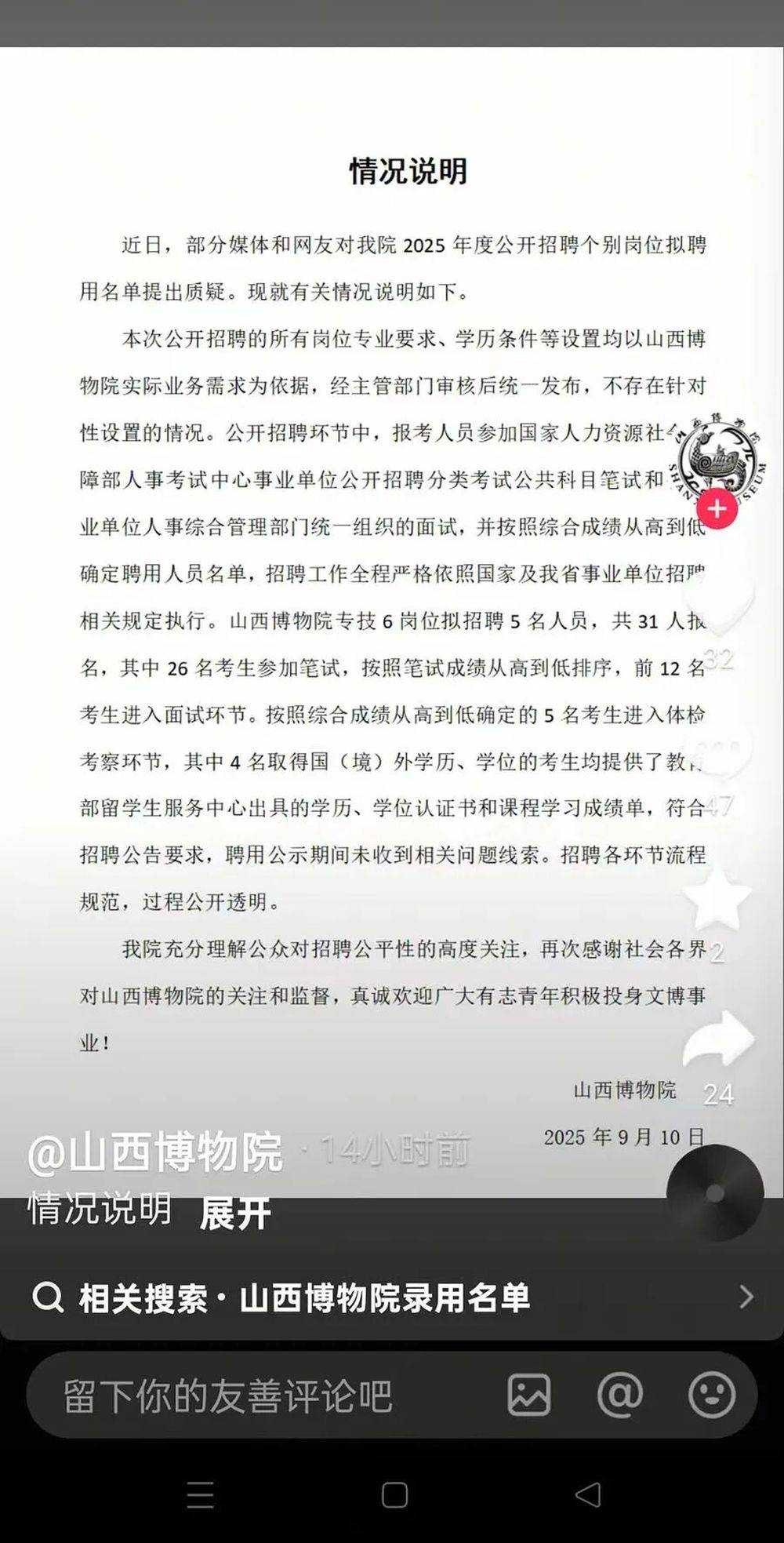 我院充分理解公众对招聘公平性的高度关注,再次感谢社会各界对山西博物院的关注和监督,真诚欢迎广大有志青年积极投身文博事业!
