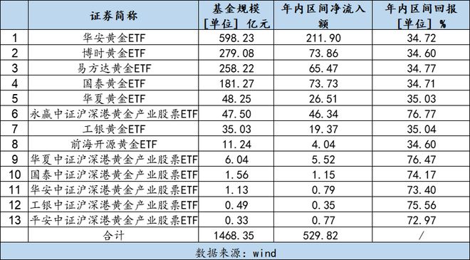 Wind数据显示,截至9月10日,全市场共计13只黄金主题ETF,合计基金规模近1500亿元,年内合计区间净流入额超500亿元。具体来看,华安黄金ETF基金规模最大,达598.23亿元。此外,博时黄金ETF、易方达黄金ETF、国泰黄金ETF基金规模均跻身百亿级别,分别为279.08亿元、258.22亿元和181.27亿元。