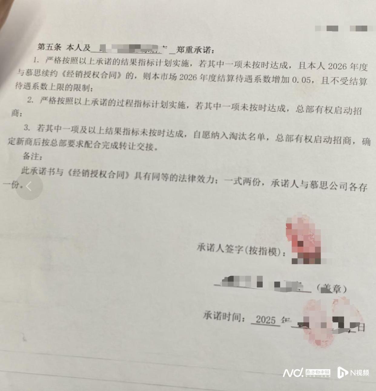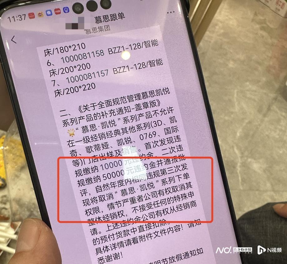 来自江苏睢宁的慕思经销商吴先生,在今年8月向南都N视频记者发来举报信,举报信称,慕思股份通过要求经销商定期更新门店装修,攫取利润;压缩新品销售周期,滞销新品由经销商买单;设立各种罚款名目,将罚款归属为“价外收入”,利润造假等。此外,还有一名来自重庆的前经销商李女士,也向记者投诉称此事。