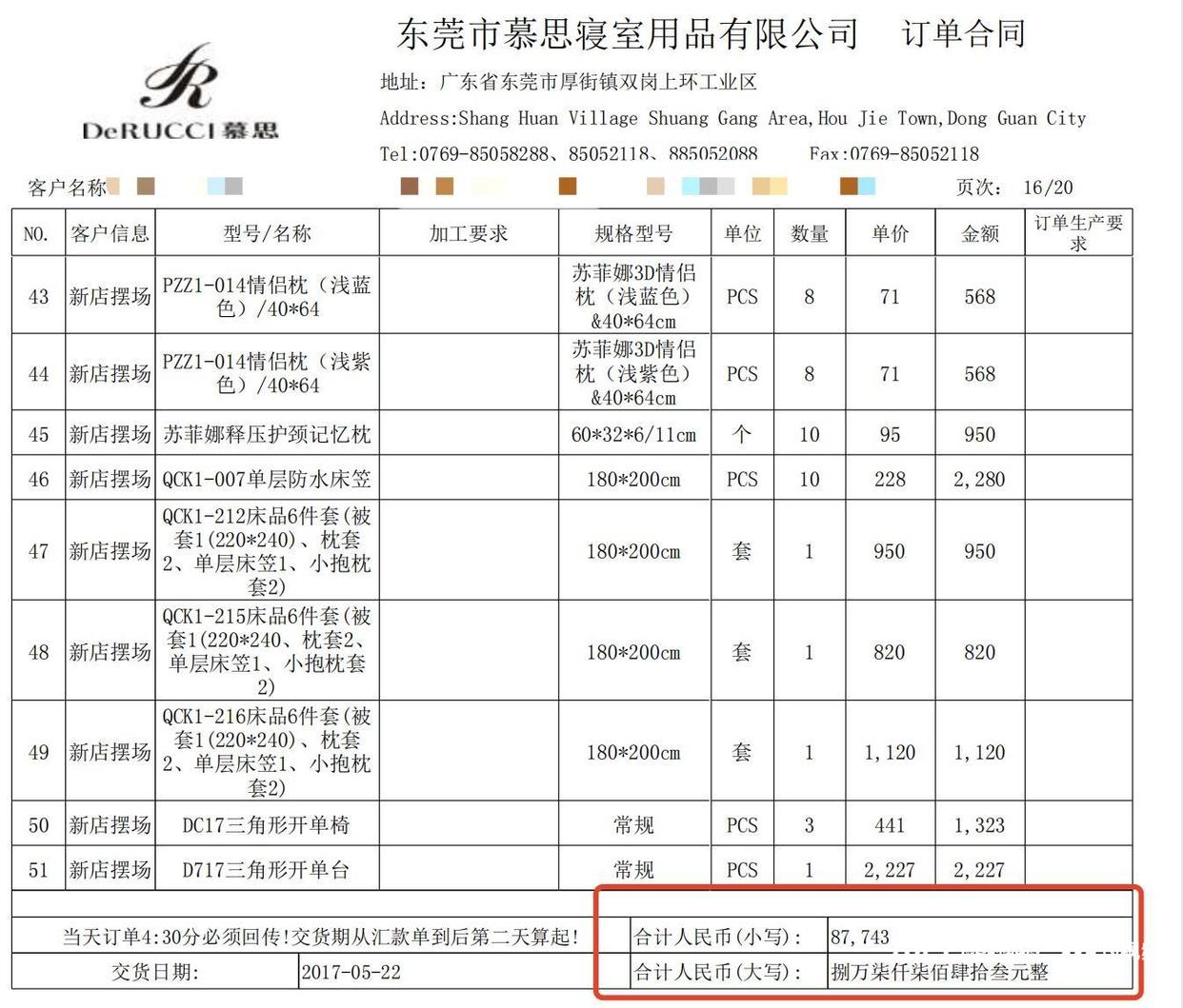 来自重庆的前慕思经销商李女士提供的订购合同显示,2017年、2019年她加盟的门店装修,店内“发光字”“墙布”“绿植装饰挂件”等,都要从慕思方面进行采购。2017年的其中一张订购合同显示,各种采购产品的如地板、墙布、遥控开关等,累计达数十万元。