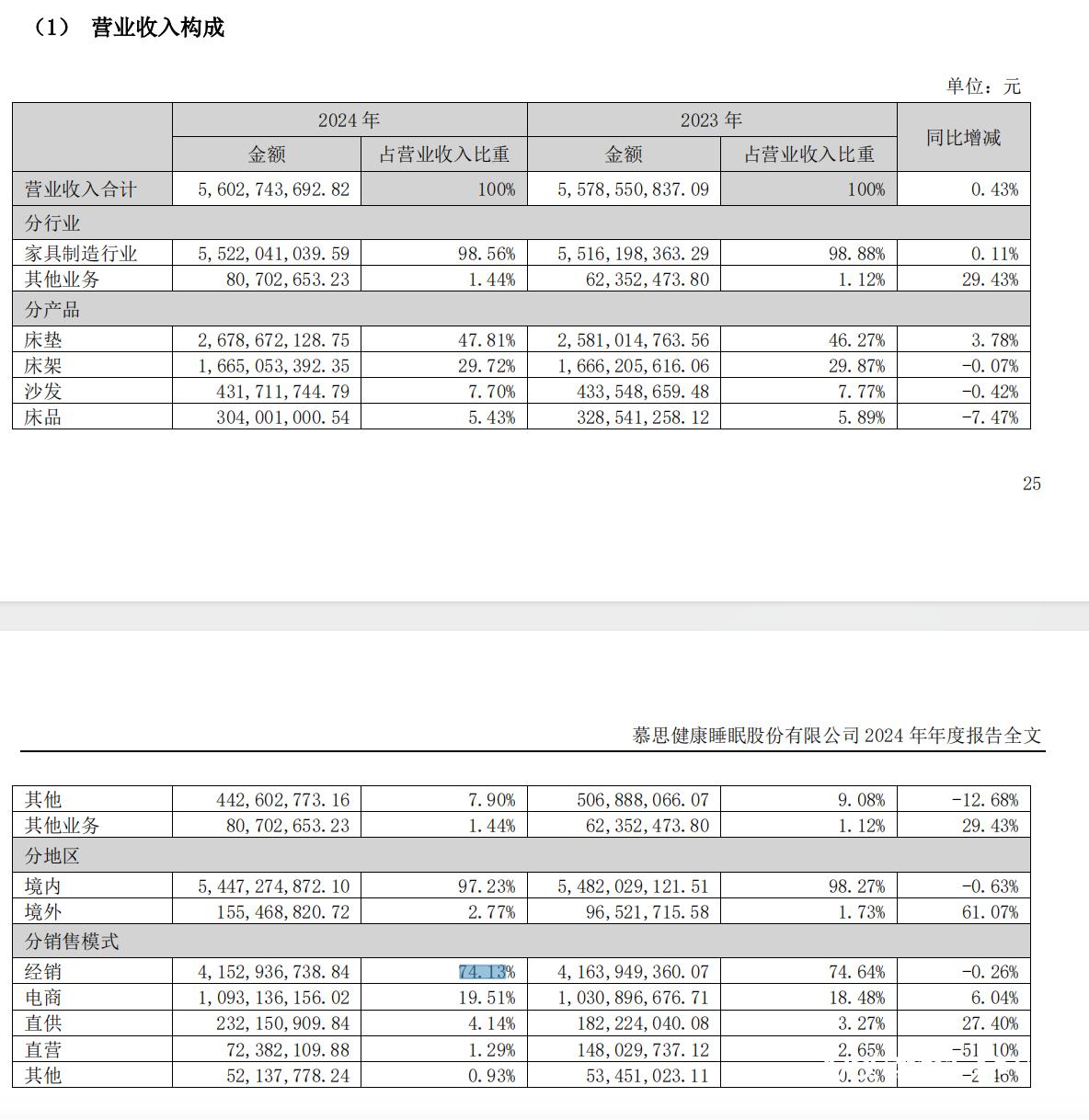 财报显示,慕思对经销模式的依赖较强,从营业收入构成方面来看,2024年,经销占其分销模式的比重高达74.13%,经销模式营收达41.53亿元。