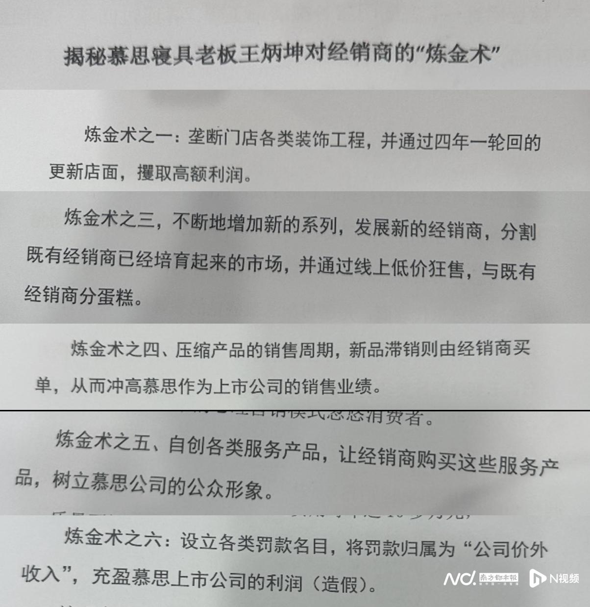 8月以来,几名来自江苏、重庆的慕思经销商、前经销商,对南都N视频记者投诉称,慕思股份通过要求经销商定期更新门店装修,攫取利润,对经销商实施末位淘汰;设立各种罚款名目,将罚款归属为“价外收入”,利润造假等。