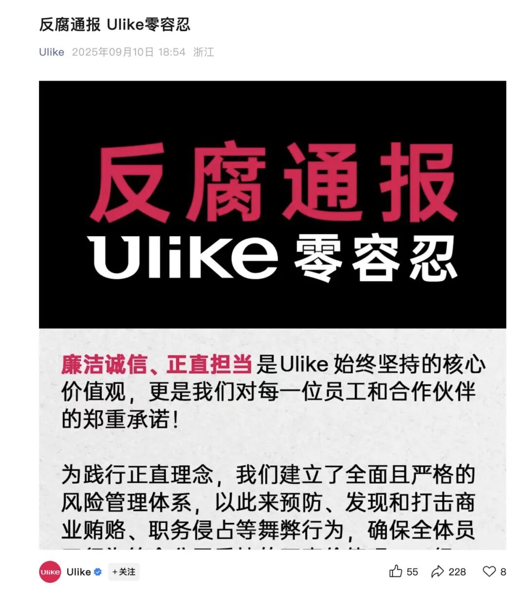 9月10日晚间,知名脱毛仪品牌Ulike在官方公众号上发文向社会公开其内部反腐成果。