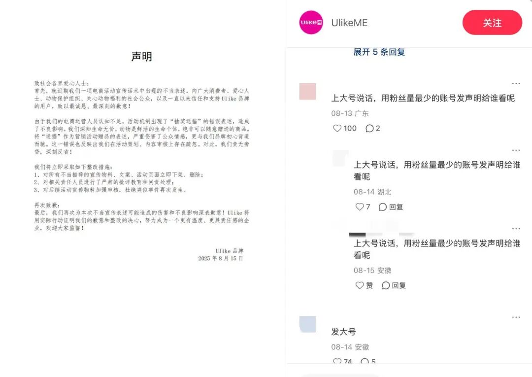 最终,Ulike通过官方账号发布致歉声明称,由于电商运营人员认知不足,活动机制出现了“抽奖送猫”的错误表述,造成了不良影响,将对所有不当措辞的宣传物料、文案、活动页面立即进行下架、删除。
