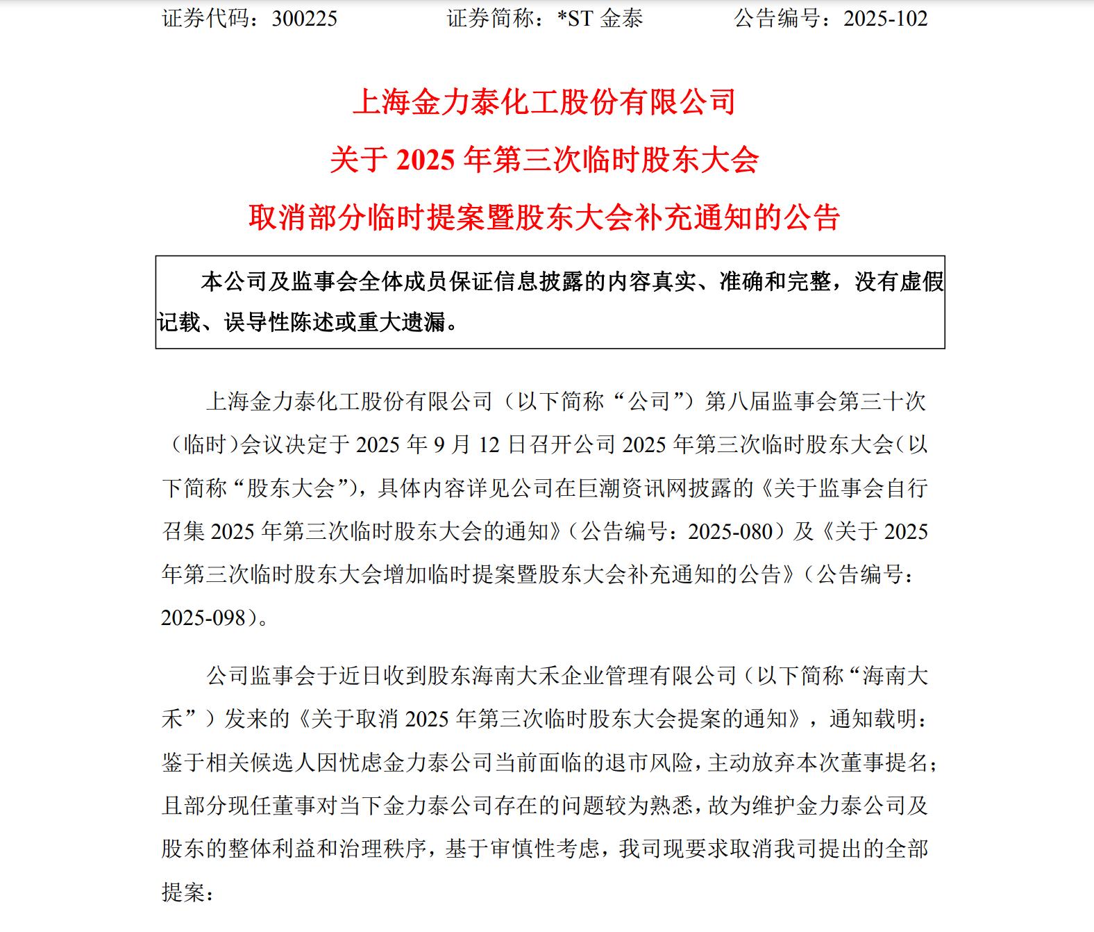 在本周五(9月12日)即将举行2025年第三次临时股东大会前夕,*ST金泰(300225.SZ)内斗事件发生大转向,第一大股东海南大禾企业管理有限公司(下称“海南大禾”)提名董事突然辞职,并撤回股东大会全部提案。