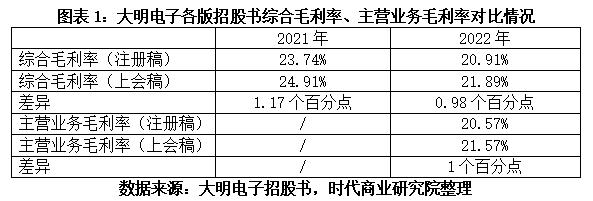 其中,大明电子2022年主营业务毛利率、2021—2022年综合毛利率三项数据,前后两版招股书分别存在约1个百分点的差异。