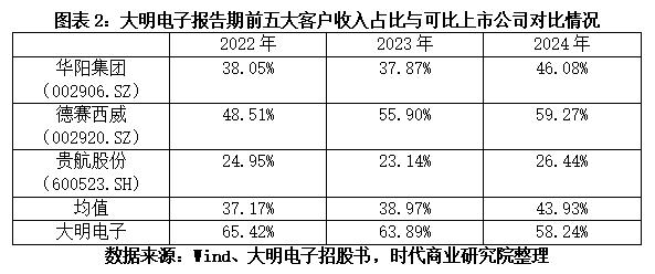 招股书显示,2022—2024年(下称“报告期”),大明电子前五大客户销售占比分别为65.42%、63.89%、58.24%,而同期同行业可比上市公司前五大客户销售占比均值分别为37.17%、38.97%、43.93%,大明电子客户集中度明显高于可比同行。