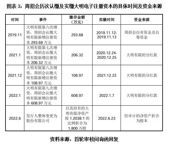 首轮审核问询函显示,周招会历史上共计4次向大明电子以货币资金的形式增资,均维持了增资完成后其持股5%的固定比例,且其中三次资金来源于大明电子的分红。