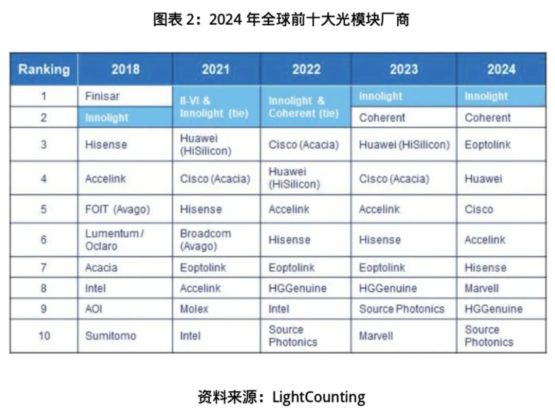 如今,中际旭创已成为全球光通信领域的标杆企业,其主营业务聚焦高端光通信收发模块的研发、生产及销售,产品覆盖云计算数据中心、5G无线网络、电信传输等核心领域,服务于全球客户。在市场研究机构LightCounting发布的2024年光模块厂商排名中,中际旭创位列全球第一,市场份额持续领跑。
