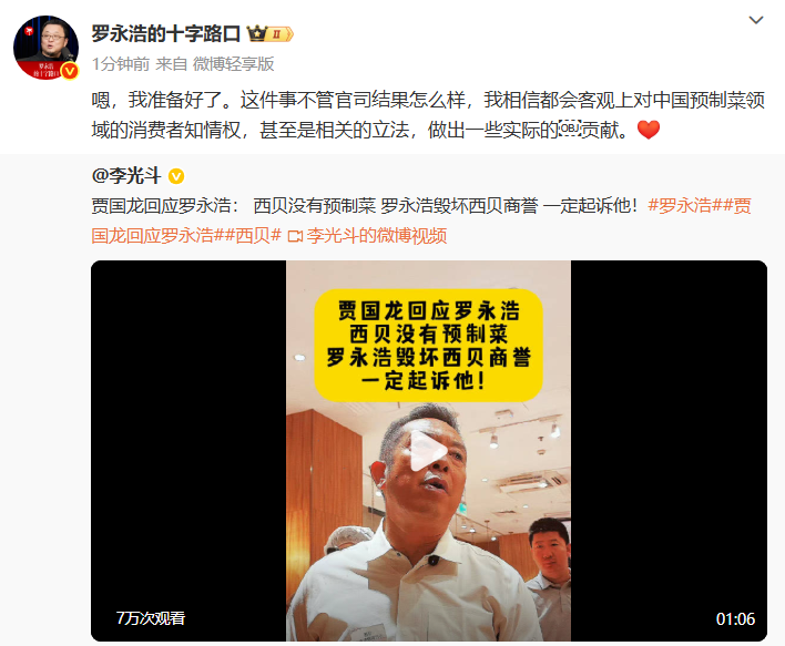 据新黄河消息,9月11日,在结束回应“预制菜”风波的新闻发布会后,西贝创始人、董事长贾国龙在接受采访时,就“是否会起诉罗永浩”一问做出明确且强硬的表态。