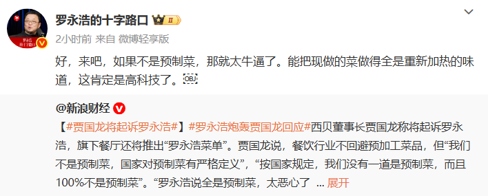 据了解,9月10日,罗永浩发微博公开吐槽连锁餐饮品牌西贝:“好久没吃西贝了,今天下飞机跟同事吃了一顿,发现几乎全都是预制菜,还那么贵。希望国家尽早推动立法,强制饭馆注明是否用了预制菜。”