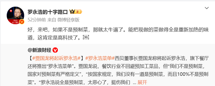当日19点多,罗永浩在微博转发“贾国龙将起诉罗永浩”的消息时评论称:“好,来吧。如果不是预制菜,那就太牛了。能把现做的菜做得全是重新加热的味道,这肯定是高科技了。”