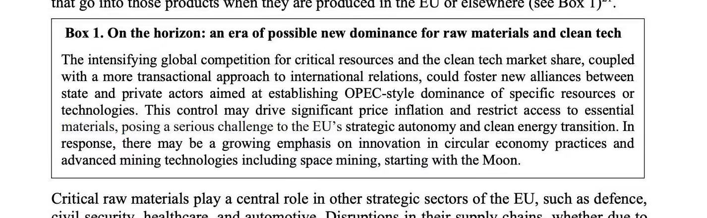 欧盟委员会以此举例并表示:“这种控制可能引发显著的价格通胀并限制关键物资的获取,对欧盟的战略自主权和清洁能源转型构成严峻挑战。作为应对,循环经济实践和先进采矿技术(包括太空采矿,从月球开始)的创新可能日益受到重视。”