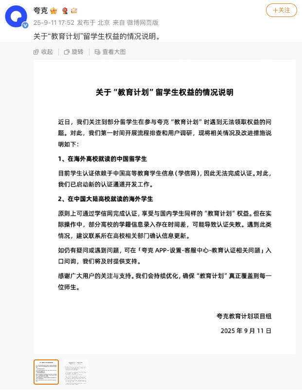 9月11日,针对“教育计划”有关争议,阿里巴巴旗下AI应用夸克发文称,对于在华海外留学生,原则上可通过学信网完成认证,享受与国内学生同样的教育计划权益。“但在实际操作中,部分高校的学籍信息录入存在时间差,可能导致认证失败。遇到此类情况,建议联系所在高校相关部门确认信息更新。”夸克方面表示。