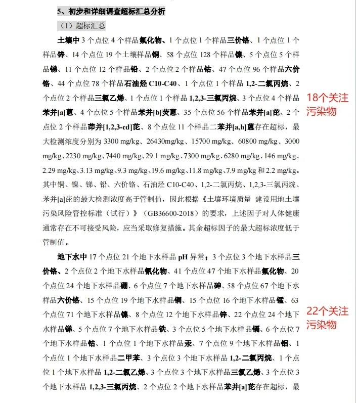 其中一份报告显示,发现土壤中苯并(a)芘、苯并(a)蒽、苯并(b)荧蒽、茚并(1,2,3-cd)芘和二苯并(a,h)蒽、1,2-二氯丙烷、1,2,3-三氯丙烷、氟化物、铜、 锑、锌、钴、镍、六价铬、石油烃(C10-C40)、铅的含量均超过了人体可接受水平;地下水中三氯乙烯、1,2-二氯丙烷的含量超过了人体可接受水平。