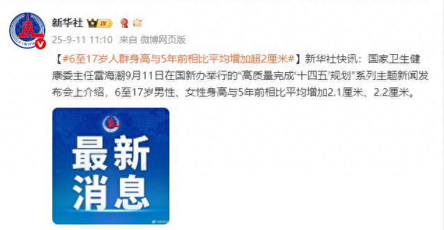 国家卫生健康委主任雷海潮9月11日在国新办举行的“高质量完成‘十四五’规划”系列主题新闻发布会上介绍,6至17岁男性、女性身高与5年前相比平均增加2.1厘米、2.2厘米。