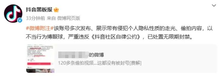 事件曝光后,短视频平台官方于9月7日下午发布公告,认定该账号“多次发布、展示带有侵犯个人隐私性质的走光、偷拍内容,以不正当行为博眼球”,已对其采取无限期封禁措施。