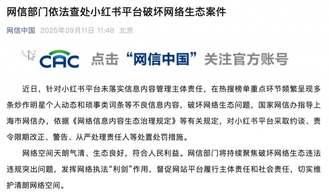 近日,针对小红书平台未落实信息内容管理主体责任,在热搜榜单重点环节频繁呈现多条炒作明星个人动态和琐事类词条等不良信息内容,破坏网络生态问题,国家网信办指导上海市网信办,依据《网络信息内容生态治理规定》等有关规定,对小红书平台采取约谈、责令限期改正、警告、从严处理责任人等处置处罚措施。