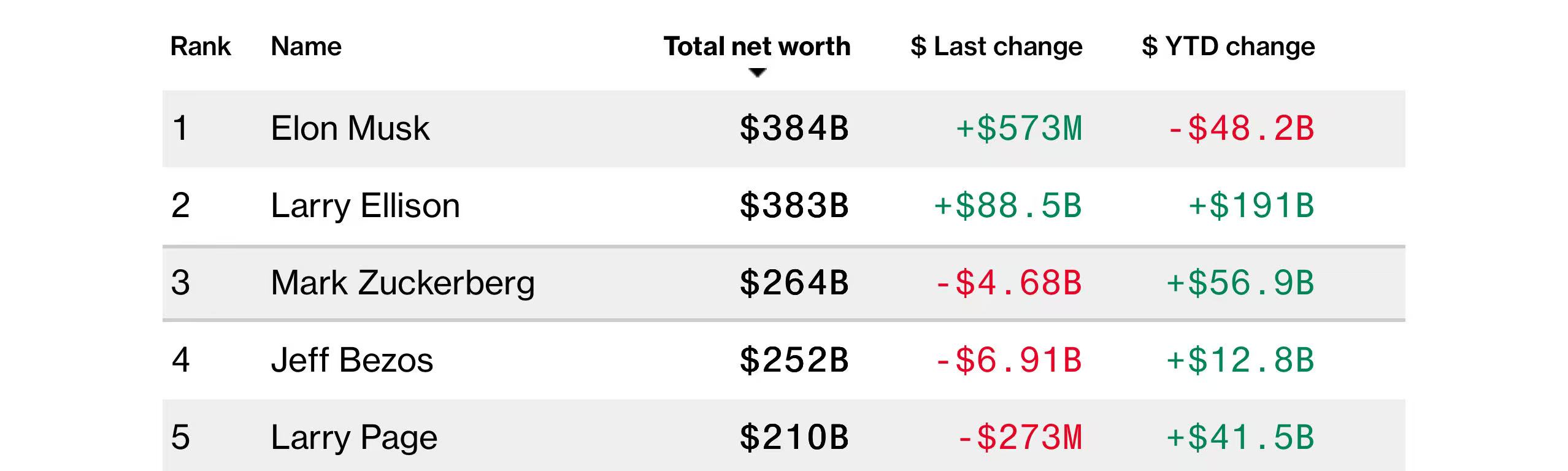 拉里·埃里森的最新身家被定格在3830亿美元,马斯克则约为3840亿美元,两人差距仅10亿美元。马斯克仍是全球首富。