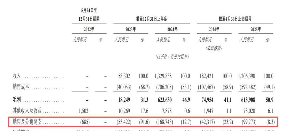 思格新能源的销售及分销开支占收入的比例也较大。2023年、2024年及2025年前四月,公司销售及分销开支分别为5342.2万元、1.69亿元及9977.3万元,销售及分销开支占同期收入的比例分别为91.6%、12.7%、8.3%。