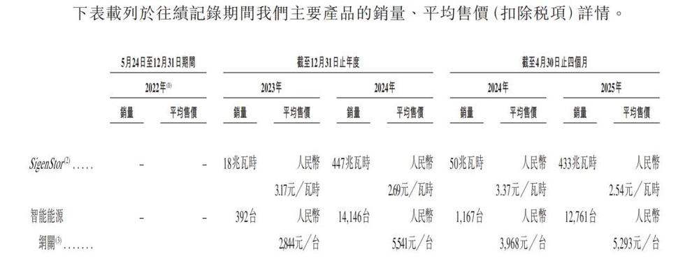 2023年6月,思格新能源推出SigenStor。据介绍,这是公司的五合一光储充一体机。2023年、2024年及2025年前四月,SigenStor实现能源容量销售总额分别为18兆瓦时、447兆瓦时及433兆瓦时。