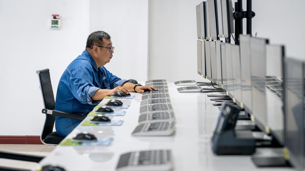 在吉林省通榆县什花道风电场控制中心,工作人员正查看风机运转数据。新华社记者 唐成卓 摄