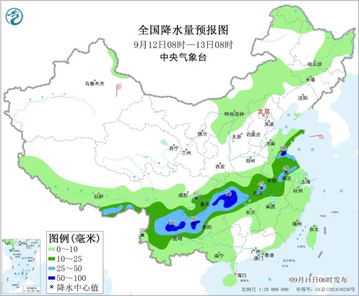 图2 全国降水量预报图(9月11日08时-12日08时)。图片来源:中央气象台网站