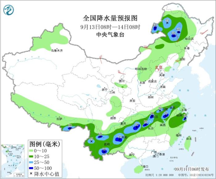 图4 全国降水量预报图(9月13日08时-14日08时)。图片来源:中央气象台网站
