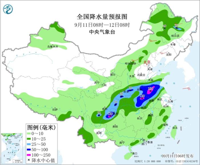 11日至12日,四川盆地、陕西南部、河南、山东、湖北、苏皖北部、贵州、湖南北部等地有中到大雨,部分地区有暴雨或大暴雨,局地伴有短时强降水等强对流天气。其中,9月11日08时至12日08时,河南大部、山东南部、安徽中北部、江苏北部、湖北中部、陕西南部、四川盆地中部和南部等地部分地区有大到暴雨,其中,河南东部和南部、山东南部、安徽北部、江苏北部、四川盆地南部等地部分地区有大暴雨(100~180毫米)(见图1)。上述部分地区伴有短时强降水(最大小时降雨量20~50毫米,局地可超过60毫米),局地有雷暴大风等强对流天气。中央气象台9月11日06时发布暴雨黄色预警。