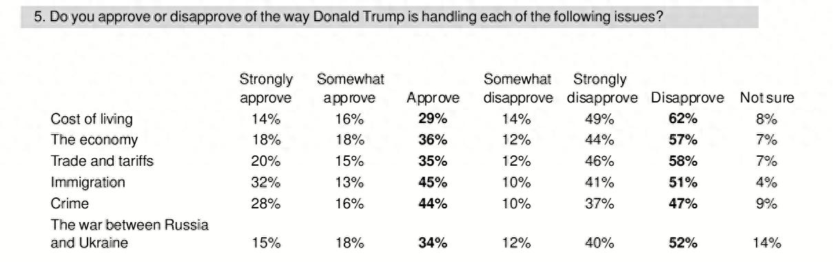 调查结果显示,特朗普在“生活成本”问题的支持率已经降低谷底,只有29%,不支持率高达62%,这一支持率表现是包括经济、移民、犯罪等所有主要议题中支持率最低的。