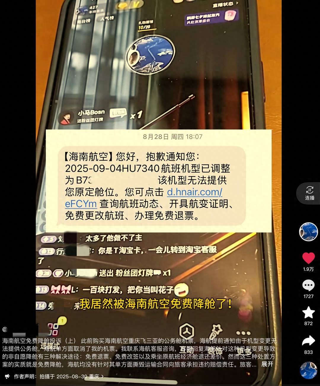 9月9日,一条标题为“海南航空免费降舱”的视频在社交媒体引发关注。视频发布者孙先生购买了从重庆飞往三亚的海航公务舱机票,后续收到航空公司通知,由于机型变更,无法提供公务舱。而客服人员提供的解决方案,在孙先生看来,均为“免费降舱”。