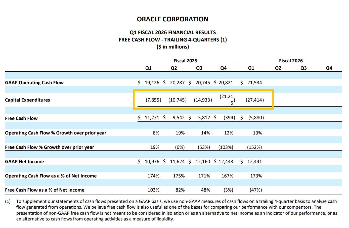 最新财报也显示,由于资本开支急剧上升,甲骨文正在处于“狂野烧钱”的状态,自由现金流快速掉头转负。