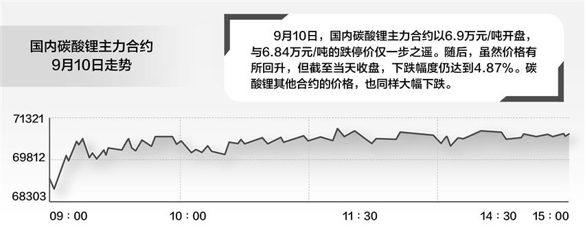 期货方面,9月10日,国内碳酸锂主力合约以6.9万元/吨开盘,与6.84万元/吨的跌停价仅一步之遥。随后,虽然价格有所回升,但截至当天收盘,下跌幅度仍达到4.87%。碳酸锂其他合约的价格,也同样大幅下跌。